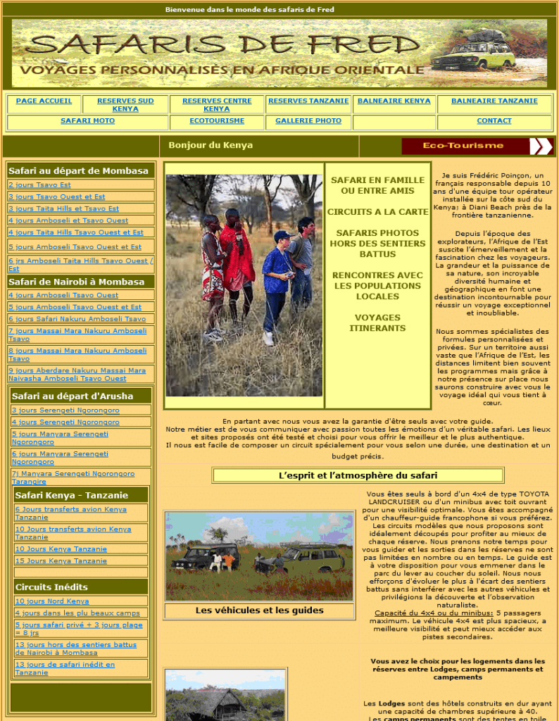 La relation avec Infocob Web commence au début des années 2000 avec un premier site internet. Ce dernier permettait déjà de montrer la variété des safaris proposés : moto, réserves, écotourisme, circuits personnalisés… Aux formules des voyages s’ajoute une belle galerie photo pour montrer la beauté des lieux visités. Un simple lien « mailto: » permet de contacter l’organisateur.
