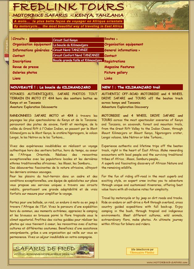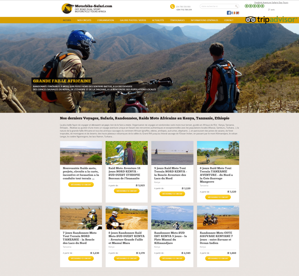 La relation se poursuit avec la construction d’un deuxième site dédié aux voyages en moto. Multilingue déjà à son époque, il permet de présenter simplement les prestations en moto au Kenya et Tanzanie.