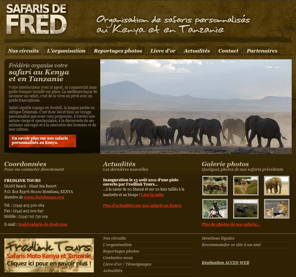 En 2011, le site principal « Safaris de Fred » se met à jour : identité plus moderne, couleurs safaris, livre d’or, page partenaire, système de recommandation à un ami, formulaires de contact… Le site fait peau neuve !