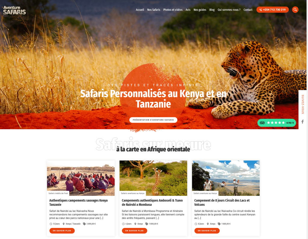 Créé en 1997 par le voyageur passionné Frédéric Poinçon, Aventure Safaris propose des voyages inoubliables au cœur de la faune et de la flore du Kenya et de la Tanzanie. L’entrepreneur français a, très tôt, compris l’intérêt d’un site web pour inviter les visiteurs français et étrangers à découvrir ses beaux voyages. Ainsi, Infocob Web fut rapidement missionné pour aider Aventure Safaris à développer ses activités grâce au web.