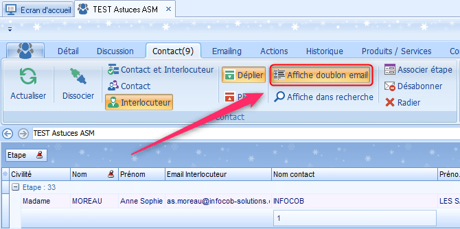 Quand on désactive le bouton « Afficher doublon email » on s’aperçoit en effet que cette adresse email existe en double :