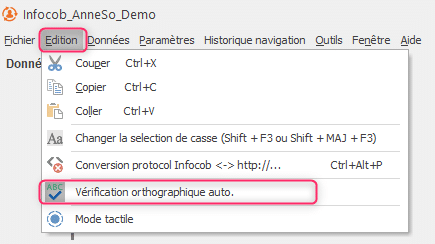 Si vous souhaitez que le correcteur vérifie automatiquement l’orthographe lors de la saisie, il faut activer dans le menu « Edition » (F10 pour afficher le menu sur Infocob) la « Vérification orthographique auto » en cliquant dessus.
