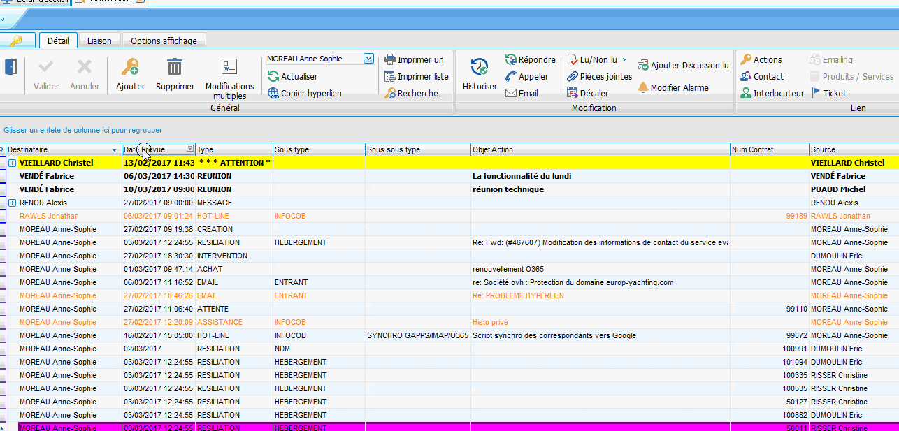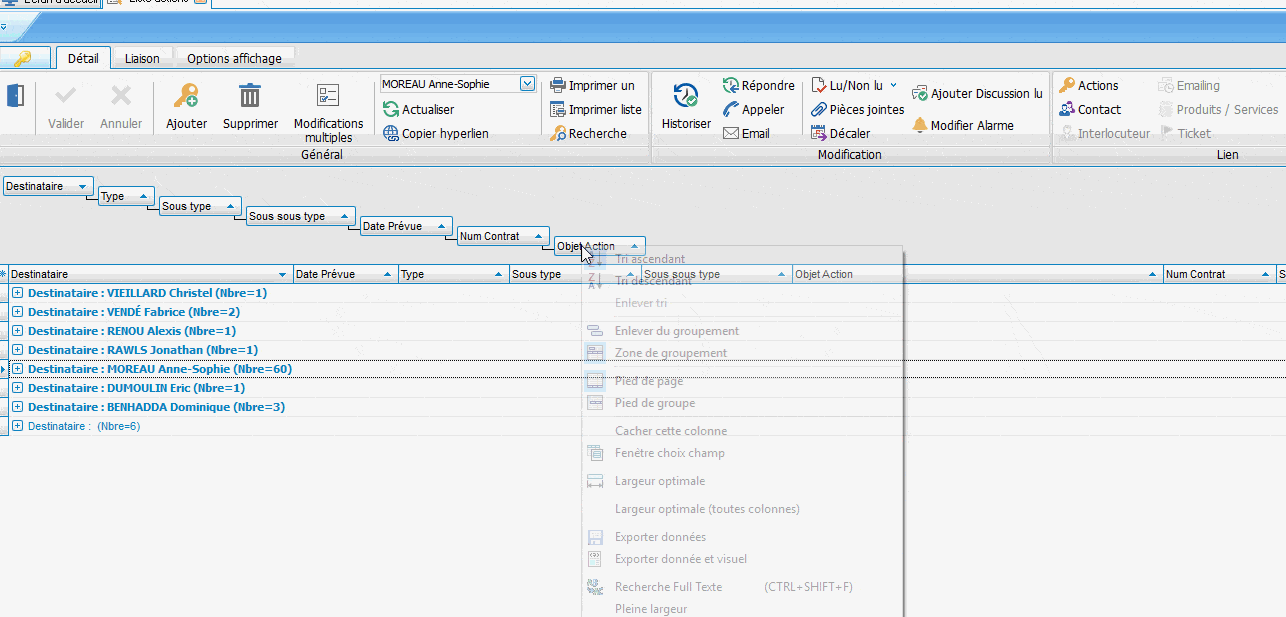 Pour regrouper par destinataire d’actions, dans n’importe quelle grille, il suffit de faire un clic droit sur l’entête de colonne désirée et de choisir : « Grouper par ce champ ».